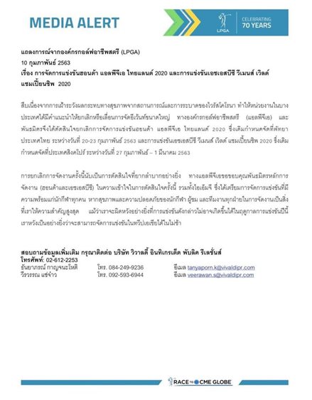 “ สืบเนื่องจากการเฝ้าระวังผลกระทบทางสุขภาพจากสถานการณ์การระบาดของไวรัสโคโรน่า ทำให้หน่วยงานในบางประเทศมีคำแนะนำให้ยกเลิกเลื่อนการจัดอีเวนท์ขนาดใหญ่ ทางองค์กรกอล์ฟอาชีพสตรี( แอลพีจีเอ) และพันธมิตร จึงได้ตัดสินใจยกเลิกการจัดการแข่งขันฮอนด้าแอลพีจีเอไทยแลนด์ 2020 ซึ่งเดิมกำหนดจัดที่พัทยาประเทศไทยระหว่างวันที่ 20 – 23 กุมภาพันธ์ 2563 และการแข่งขันเอช เอสบีซี เวิลด์ แชมเปียนชิพ 2020 ซึ่งเดิมกำหนดจัดที่ประเทศสิงคโปร์ระหว่างวันที่ 27 กุมภาพัน – 1 มีนาคม 2563