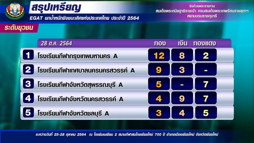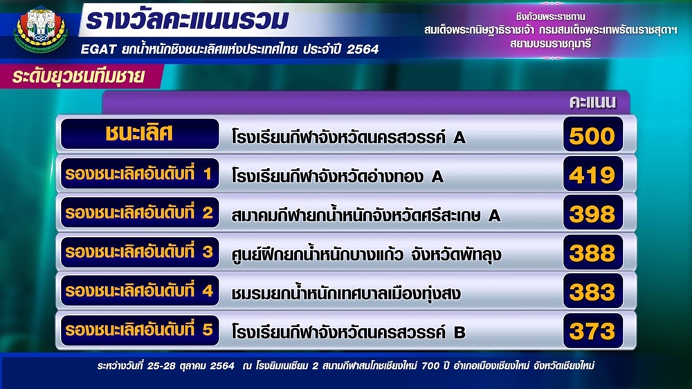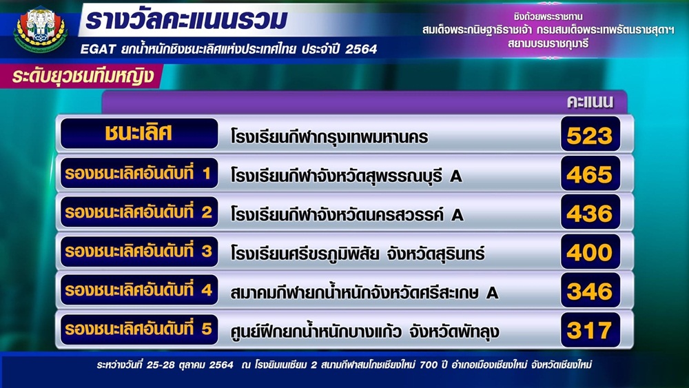 ทีมยกน้ำหนัก โรงเรียนกีฬานครสวรรค์ ชนะเลิศคะแนนรวมยุวชน ชาย-หญิง ได้รับถ้วยพระราชทาน สมเด็จพระกนิษฐาธิราชเจ้า กรมสมเด็จพระเทพรัตนราชสุดาฯ สยามบรมราชกุมารี ที่จังหวัดเชียงใหม่