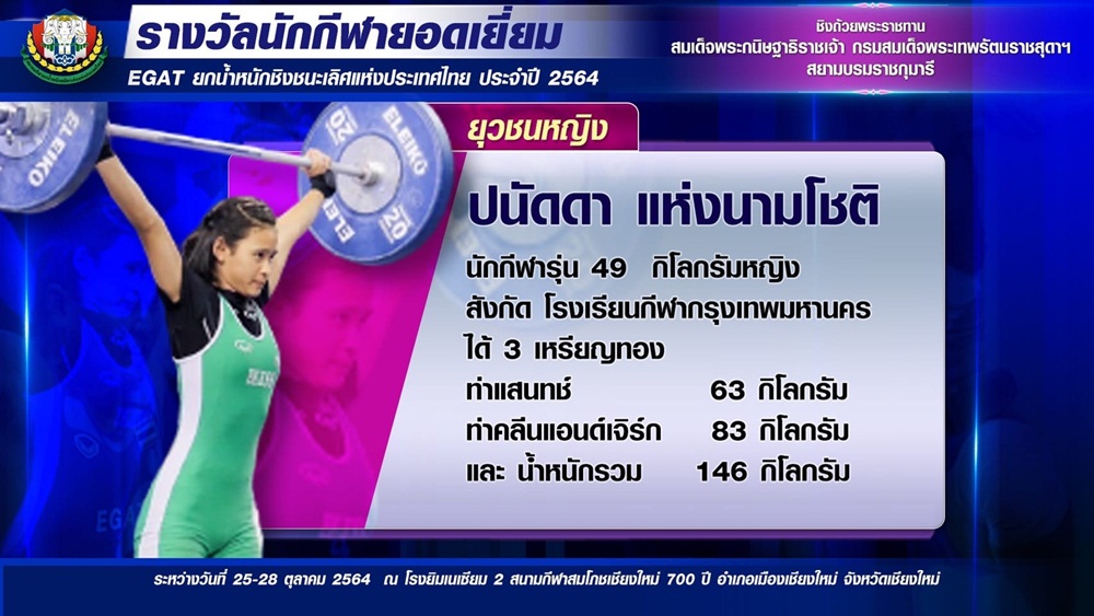 28 ต.ค. 64 การแข่งขัน EGAT (อีแกท) ยกน้ำหนัก ชิงชนะเลิศแห่งประเทศไทย ประจำปี 2564 ระดับยุวชน ชิงถ้วยพระราชทาน สมเด็จพระกนิษฐาธิราชเจ้า กรมสมเด็จพระเทพรัตนราชสุดาฯ สยามบรมราชกุมารี ที่โรงยิมเนเซียม 2 สนามกีฬาสมโภชเชียงใหม่ 700 ปี อ.เมืองเชียงใหม่จ.เชียงใหม่ โดยสมาคมกีฬายกน้ำหนักสมัครเล่นแห่งประเทศไทย ในวันสุดท้าย ผลการแข่งขันวันสุดท้าย รุ่น 64 กิโลกรัมหญิง พัชราภา พลัดพูนผล จากโรงเรียนกีฬาเทศบาลนครนครสวรรค์ ทีม A กวาด 3 เหรียญทอง จากท่าสแนทช์ 66 กิโลกรัม คลีนแอนด์เจิร์ก 81 กิโลกรัม น้ำหนักรวม 147 กิโลกรัม