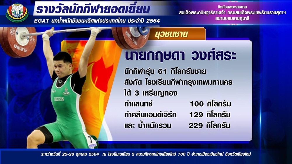 สำหรับรางวัล นักกีฬายอดเยี่ยมยุวชนชาย ได้แก่ กฤษดา วงศ์สระ นักกีฬารุ่น 61 กก. สังกัดโรงเรียนกีฬากรุงเทพมานคร ได้ 3 เหรียญทอง ในท่าแสนทช์ 100 กก. ท่าคลีน แอนด์ เจอร์ค 129 กก. และสถิติคะแนนรวม 229 กก.