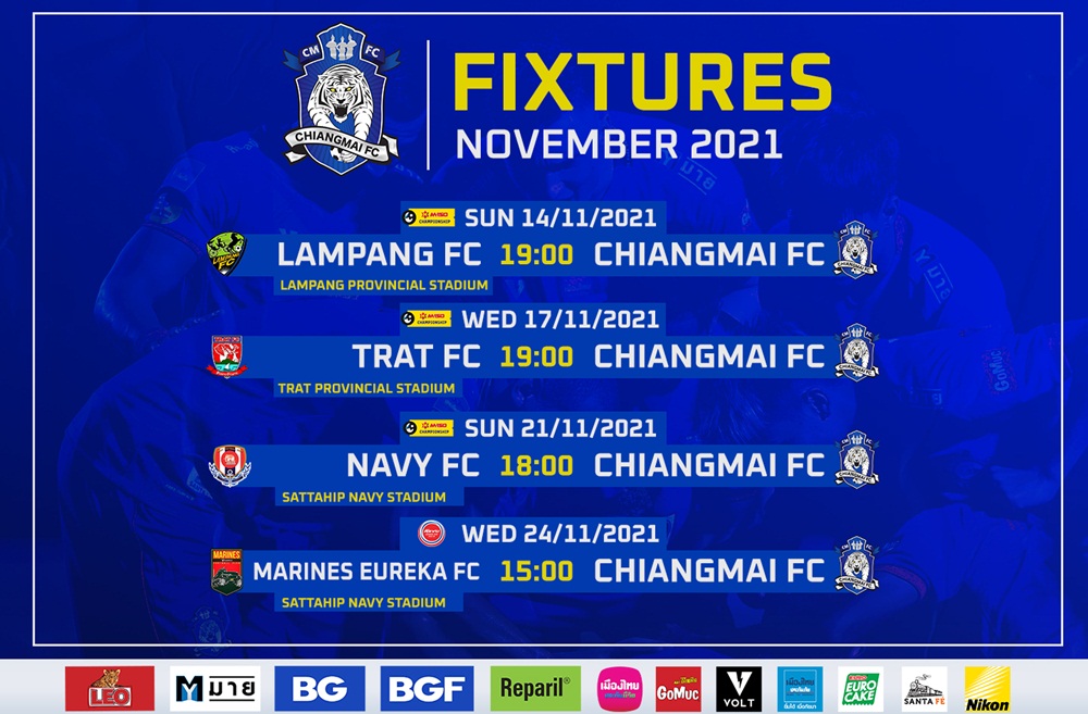 จากการสลับโปรแกรมดังกล่าว ทำให้โปรแกรมการแข่งขันศึก T2 ของเชียงใหม่ เอฟซี นัดที่ 13-15 หรือระหว่างวันที่ 14-21 พ.ย.64 เป็นดังนี้ อาทิตย์ที่ 14 พ.ย.64 ลำปาง เอฟซี พบ เชียงใหม่ เอฟซี เวลา 19.00 น. สนามกีฬากลางจังหวัดลำปาง (หนองกระทิง), พุธที่ 17 พ.ย.64 ตราด เอฟซี พบ เชียงใหม่ เอฟซี เวลา 19.00 น. สนามกีฬากลางจังหวัดตราด, อาทิตย์ที่ 21 พ.ย.64 สโมสรฟุตบอลราชนาวี พบ เชียงใหม่ เอฟซี เวลา 18.00 น. สนามราชนาวี กม.5 สัตหีบ ขณะที่ฟุตบอล “รีโว่ ลีก คัพ” รอบเพลย์ออฟ กำหนดการแข่งขันใหม่ เป็นวันพุธที่ 24 พ.ย.64 นาวิกโยธิน ยูเรก้า เอฟซี พบ เชียงใหม่ เอฟซี เวลา 15.00 น. สนามกีฬาราชนาวี กม.5